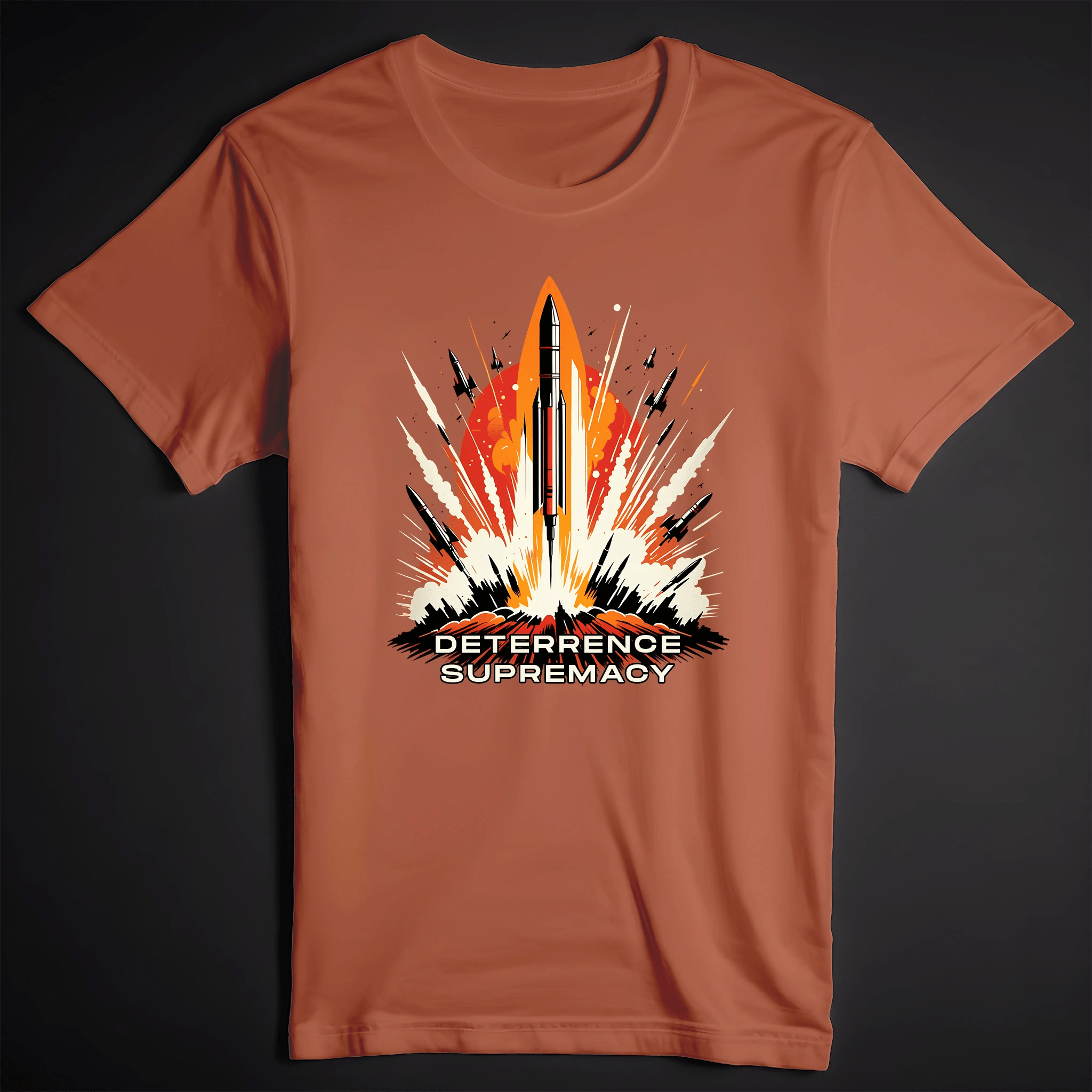 Deterrence Supremacy – A military strategy that involves a state using its military superiority to deter an attack from an adversary. This eye-catching fire-colored shirt is inspired by Scott Ritter’s expert analysis on propnco.com. It’s a comfortable, stylish way to spark conversations about global strategy. Wear your geopolitical savvy – order now and stand out in this unique, thought-provoking design.