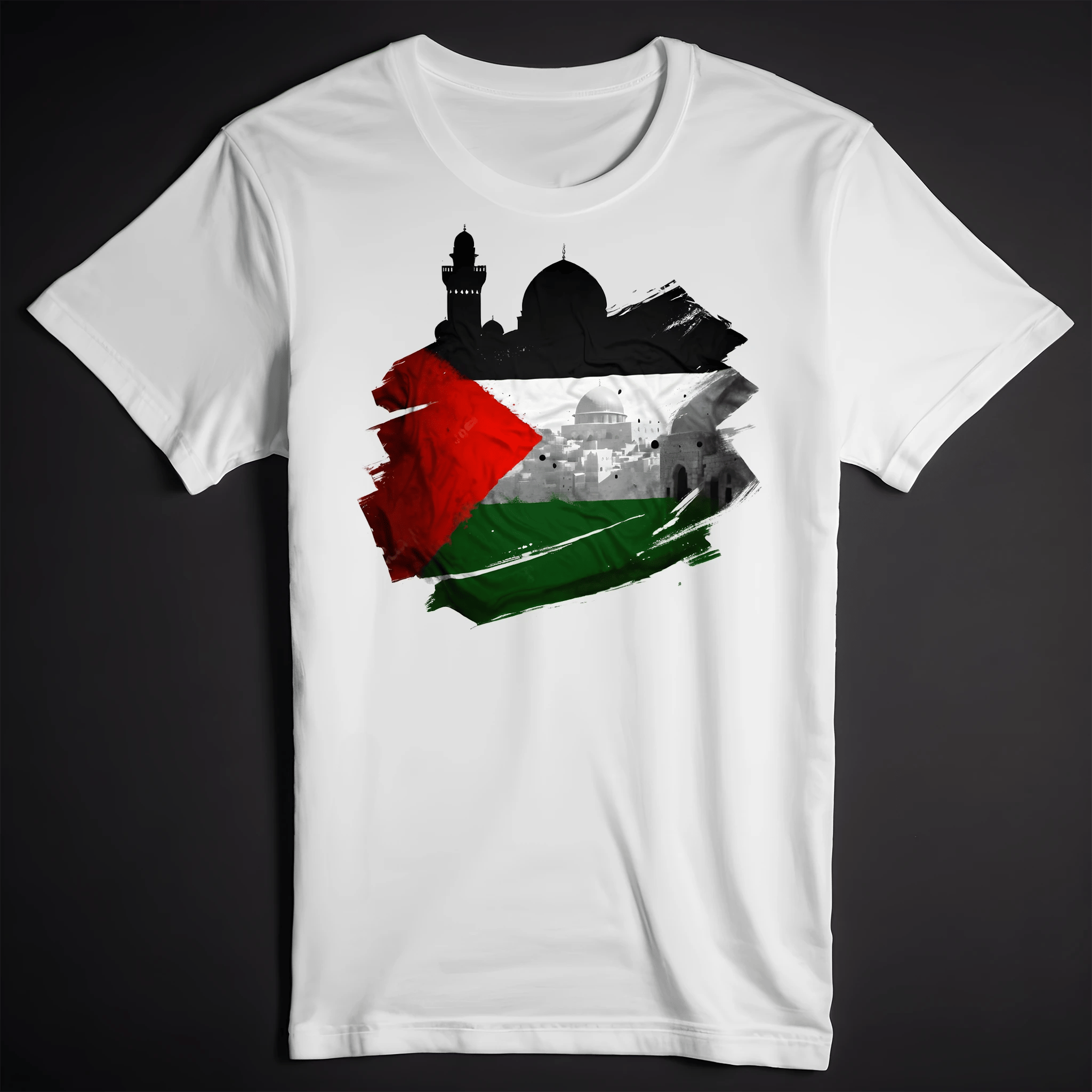 Make a bold statement with our “Palestine Silhouette” tee, featuring a powerful fusion of the Palestinian flag and the iconic silhouette of Al-Aqsa Mosque in a gritty, street art-inspired style.