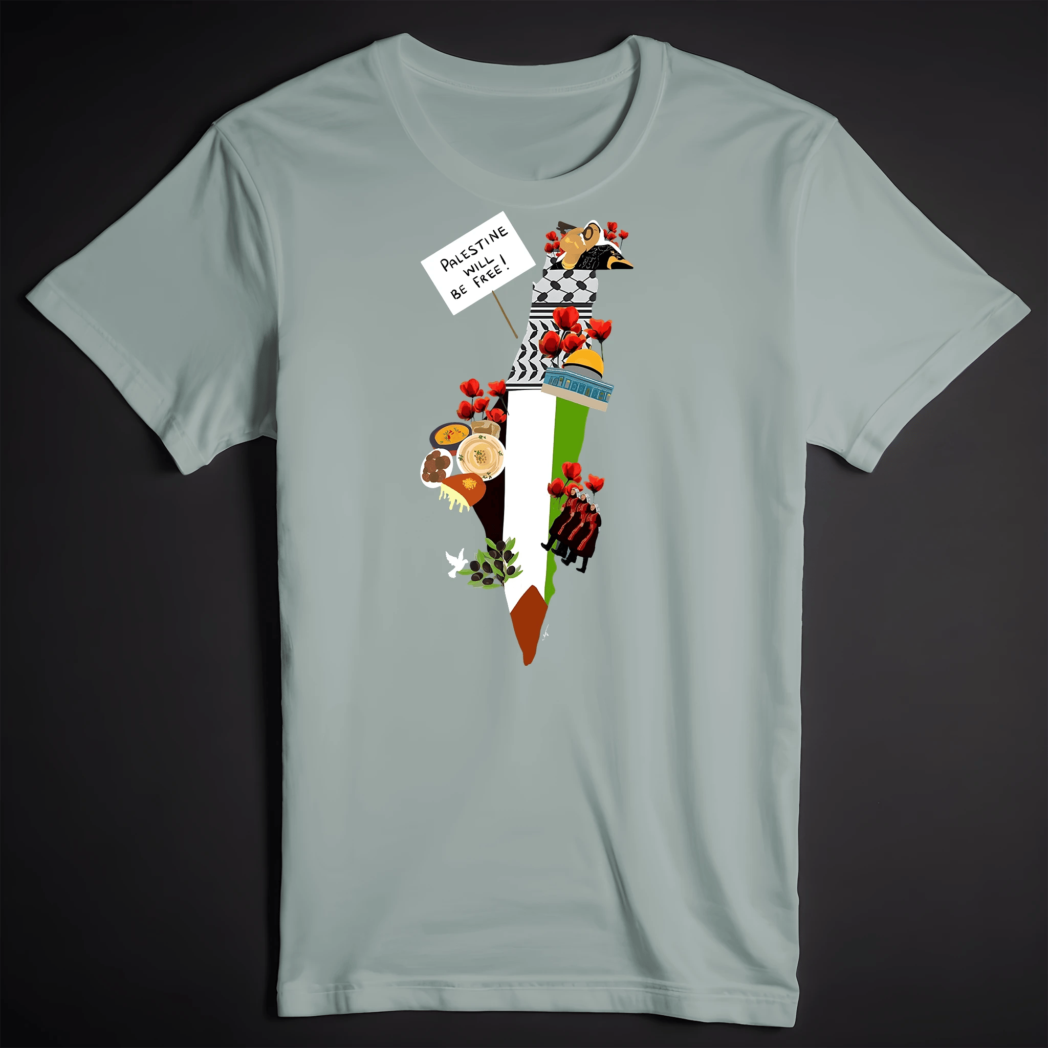Proudly display your Palestinian heritage with our “Palestine Will Be Free” tee, featuring a beautifully illustrated pre-1948 map of Palestine adorned with traditional motifs, foods, and the iconic Al-Aqsa Mosque.